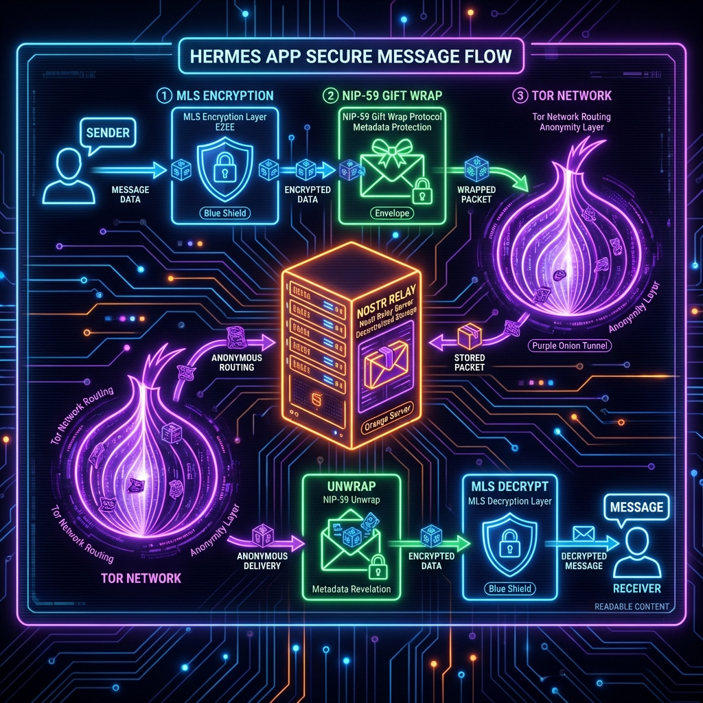 Hermes is built on a stack of decentralized and privacy-preserving technologies. It combines Nostr for transport, MLS (Messaging Layer Security) for encryption, and Tor for network anonymity.